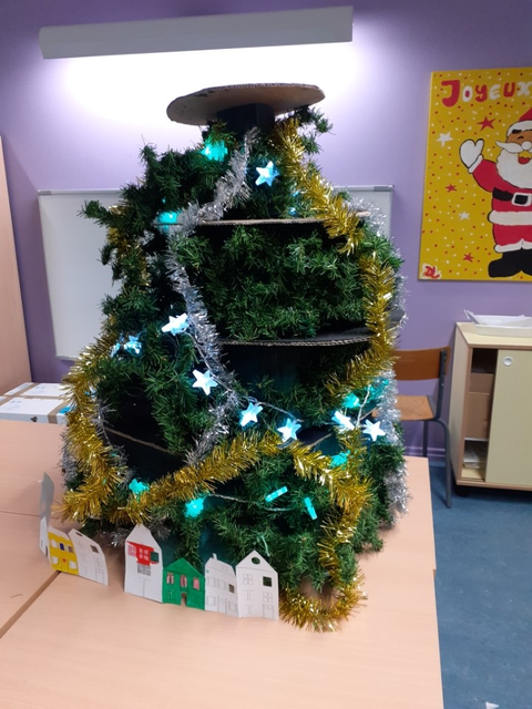 Un de nos objectifs éducatifs est le développement durable. Ainsi, Priscillia et les enfants ont créé un sapin de Noël en matériel recyclé.
