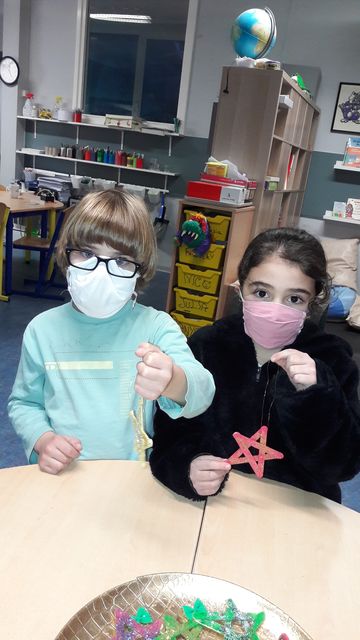 Avec les enfants, nous avons fait un bricolage de Noël. Ce bricolage était à l’initiative des enfants du périscolaire. Nous avons fabriqué des petites étoiles avec des bâtonnets de glace que les enfants ont peints avec des pinceaux. Ensuite ils les ont décorés avec des paillettes. Ce bricolage était facile et rapide, il n’a duré que 30 minutes. Le tout dans le respect du protocole sanitaire !