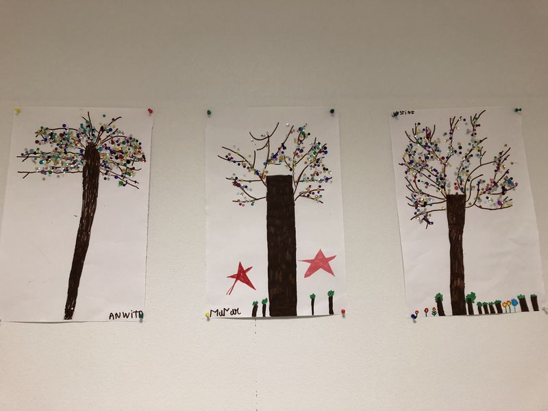 Des tableaux fabriqués à l’aide de feuilles d’arbres ont été conçus par les enfants. D’autres bricolages sont en construction comme des citrouilles en papier et des pantins aux allures de fantôme !