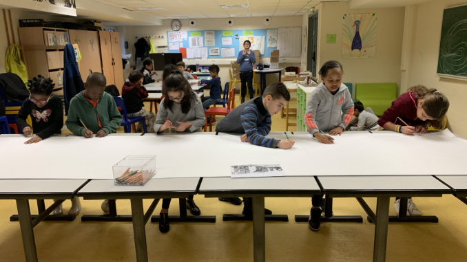 Certains enfants sont en train de faire une fresque coopérative, intitulée « Le village ». Elle servira à décorer le couloir du périscolaire. Tous ensemble ils vont alors devoir imaginer, dessiner et peindre.