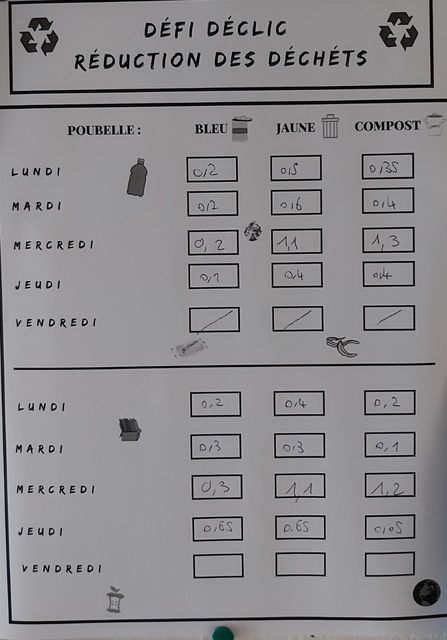 Nous pesons chacune des catégories et nous les rentrons sur le site ainsi que dans un tableau pour voir l’impact que le tri a sur nos poubelles. Par exemple, pendant la première période, nous avons eu une moyenne d’un kilo de déchets qui allaient dans la poubelle bleu, depuis la deuxième phase, il n’y a plus que 0.3 kilo de déchets non recyclables qui vont dans la poubelle bleu. Nous recyclons donc en moyenne 0.7 kilo de déchets.