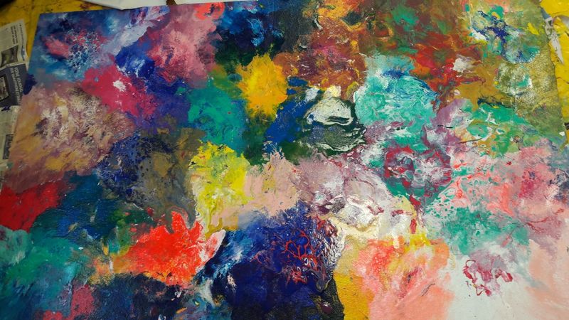 Les enfants ont préparé des mélanges de peinture dans des bocaux qu’ils ont renversé tour à tour sur la toile laissant la peinture fluidifiée s’étaler et se mélanger pour illustrer à travers une création aléatoire le morceau de musique classique.