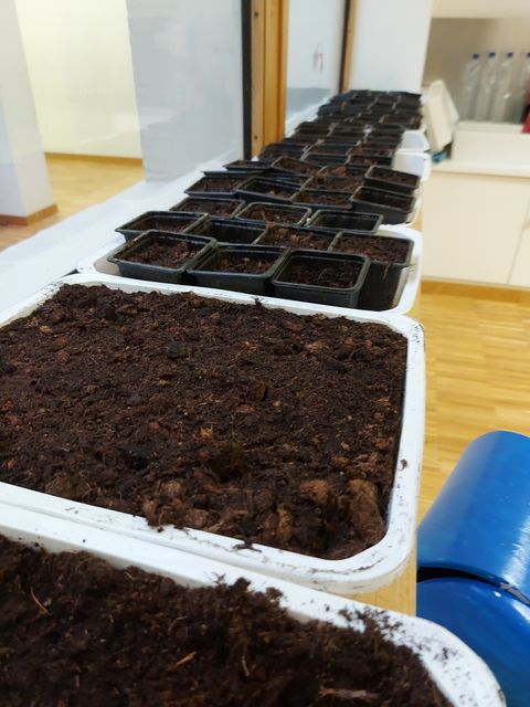Durant la semaine du 15 au 19 Mars, nous avons réalisé pas moins de 200 semis, de 20 semences différentes (tomate cerise, noir de Crimée, aubergine, courgette, butternut, maïs sucré, potiron, etc).