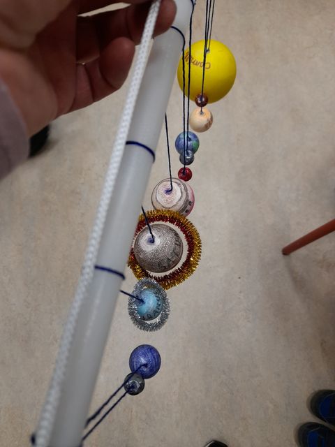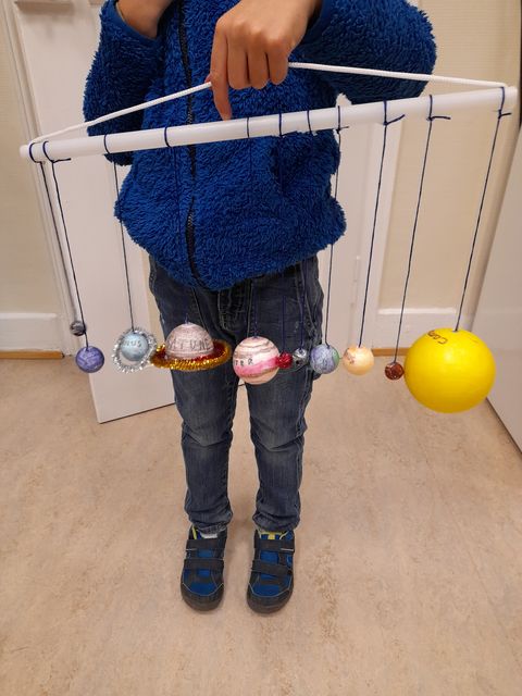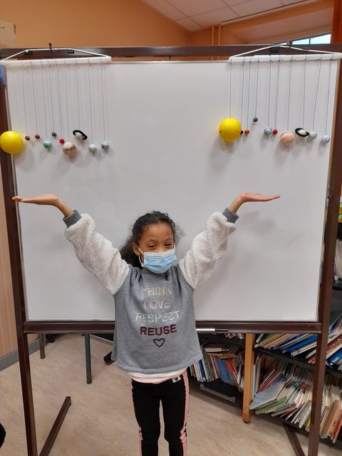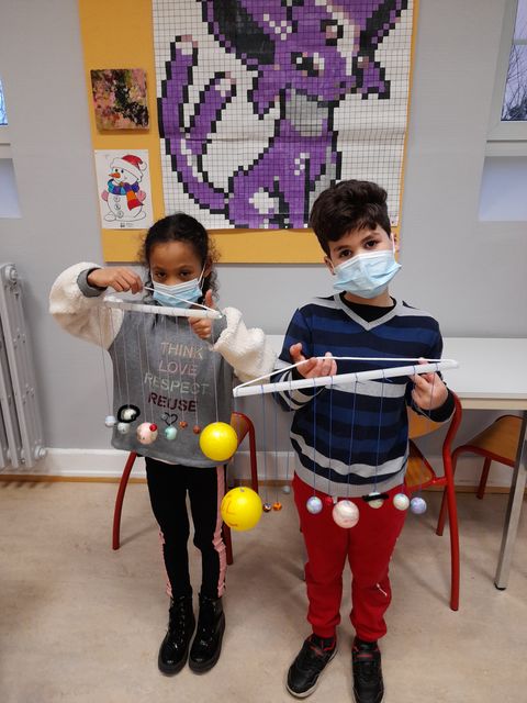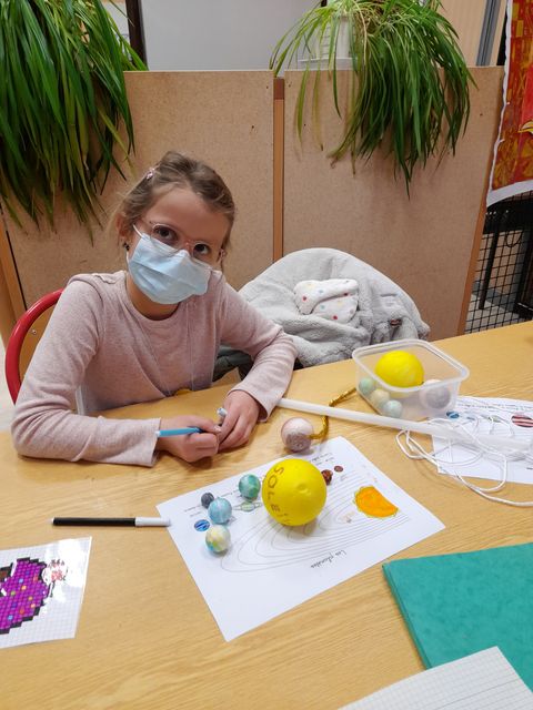 Durant le mois de janvier, les CP-CE1-CE2 ont découvert le système solaire : discussion et découverte des planètes qui le compose, recherche sur internet, fabrication de son propre système solaire. Les enfants ont représenté le soleil, les différentes planètes, et certains satellites comme la Lune.