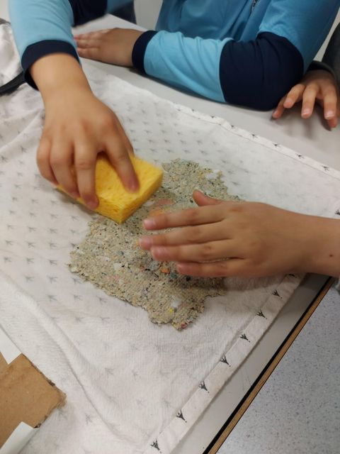 Les Ecorangers ont proposé aux enfants des classes de CE et CM un atelier fabrication de papier recyclé mardi 15 mars. Ainsi, jeudi 17 mars, les enfants ont pu l’utiliser pour y faire des dessins dessus sur le thème de la nature et de l’environnement.