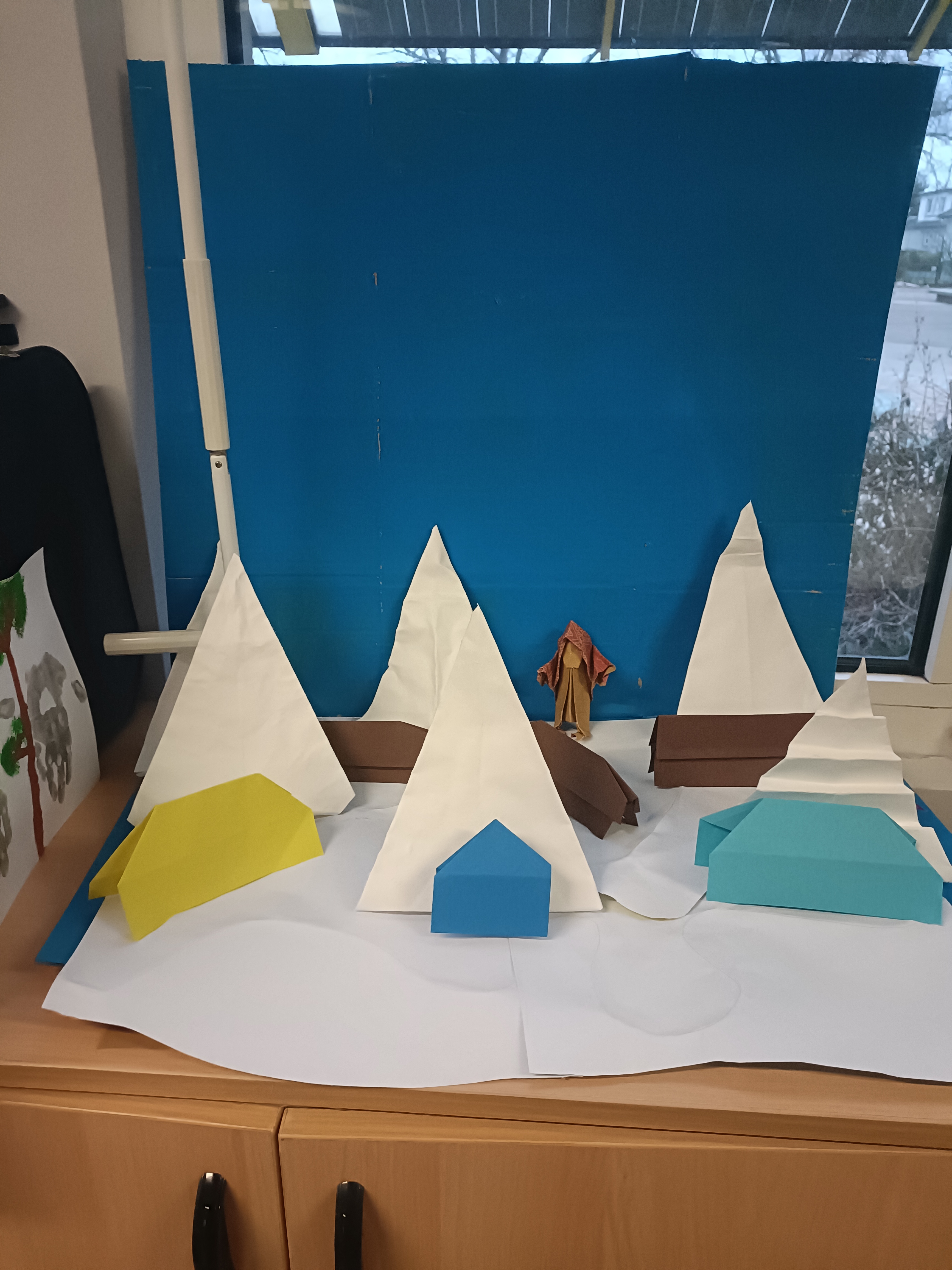 Ils ont reçu l’aide de Franck qui a mené sur quelques séances un projet origami pour concevoir un village enneigé qui trône fièrement au périscolaire.