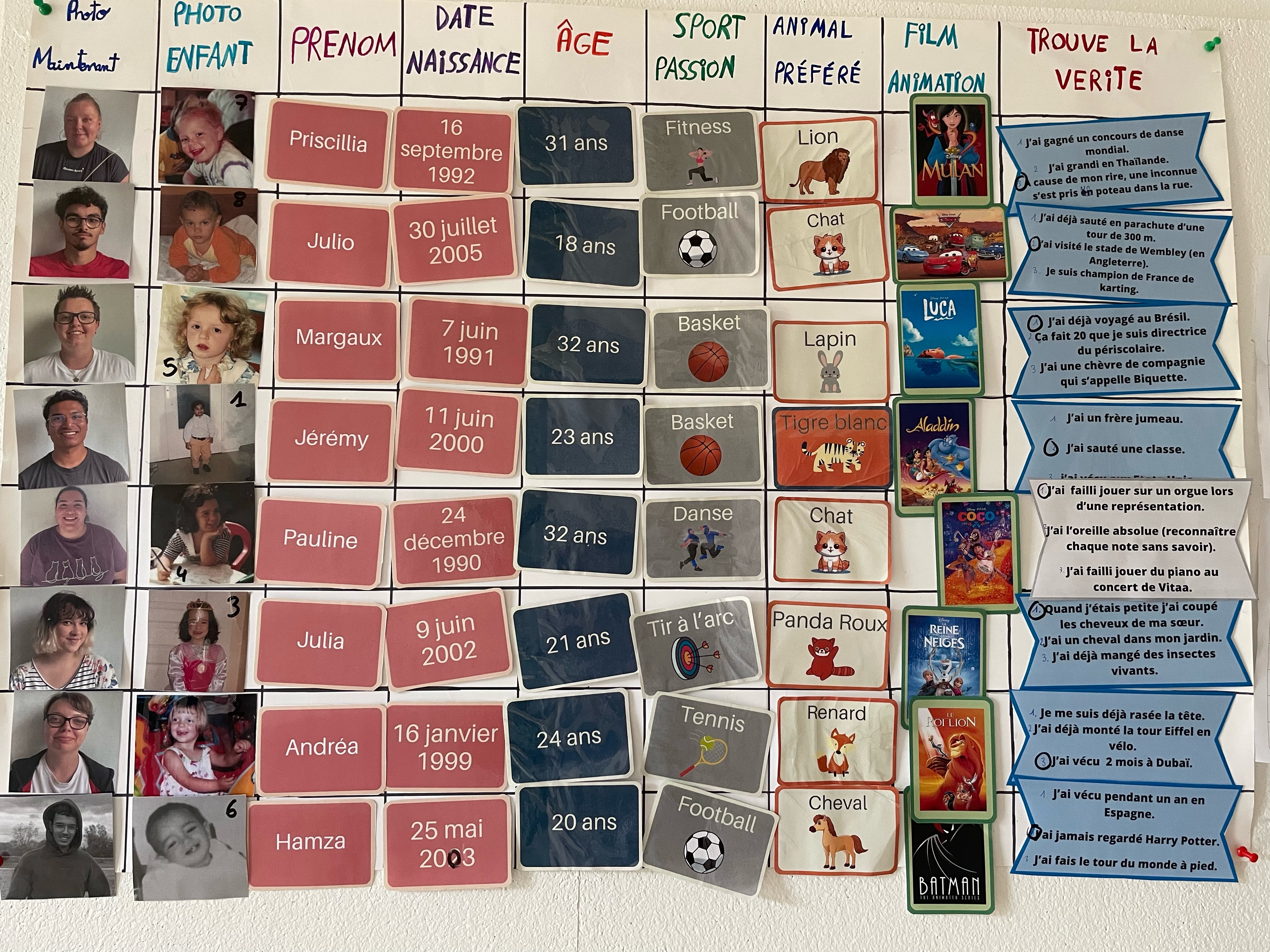 Le jeu, intitulé « Le qui est-ce des anims ? », était composé de différents ateliers où les enfants devaient retrouver, deviner ou déduire nos âges, nos sports/passions, nos films préférés…