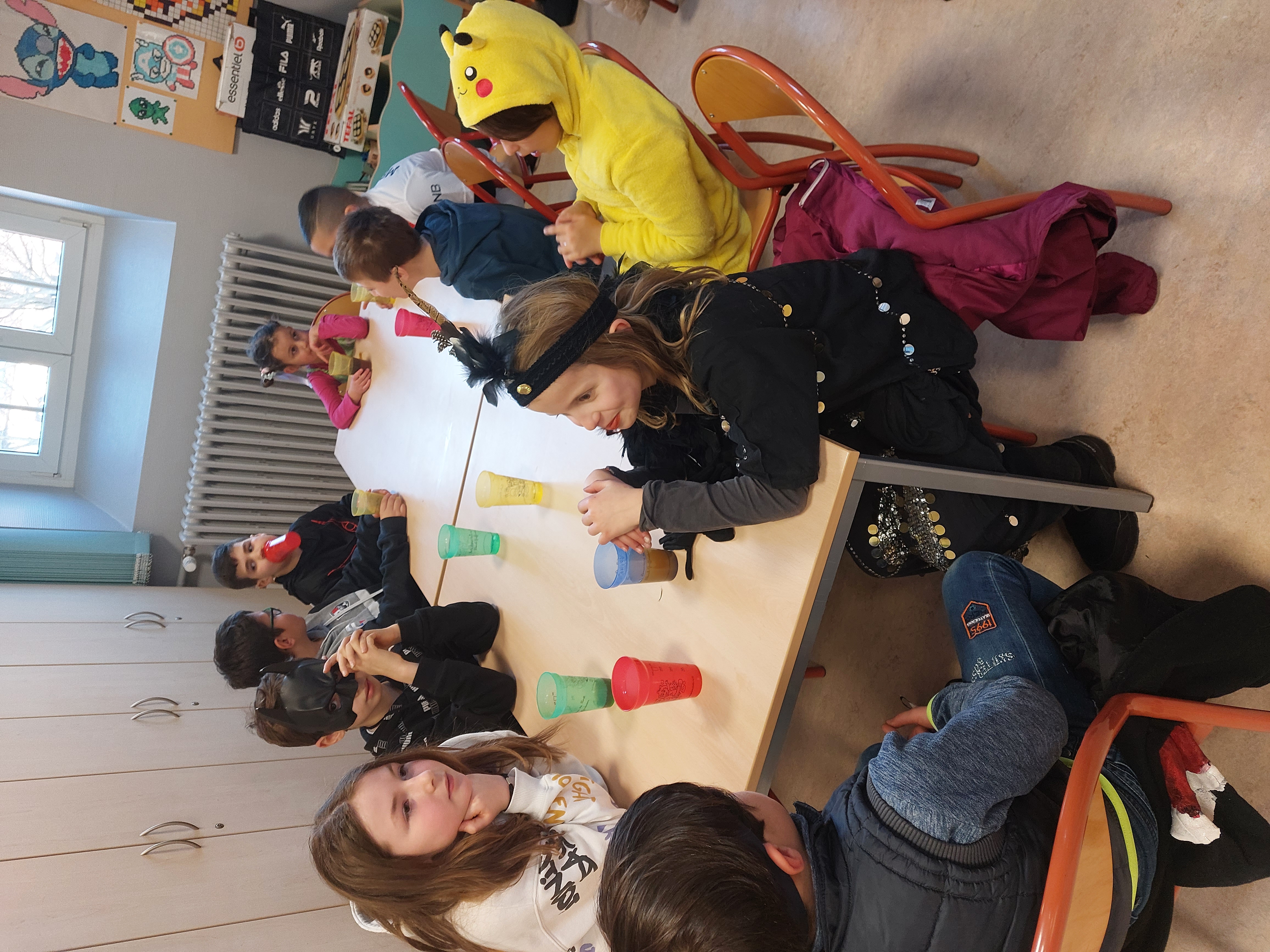 Jeudi 9 février, tout le périscolaire était invité à revêtir sa plus belle tenue de carnaval. Le temps n’étant pas au beau fixe et la nuit tombante, nous avons donc décidé de déambuler au sein de l’école et du périscolaire sur un rythme endiablé.