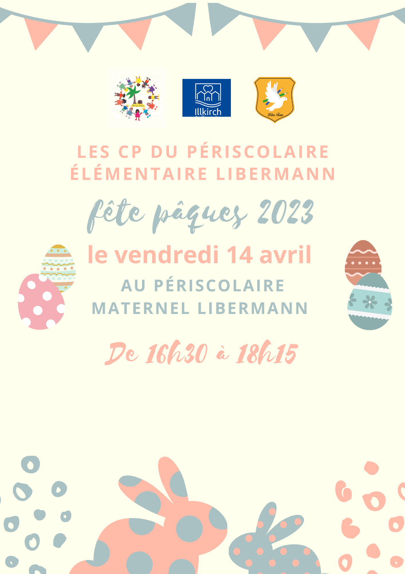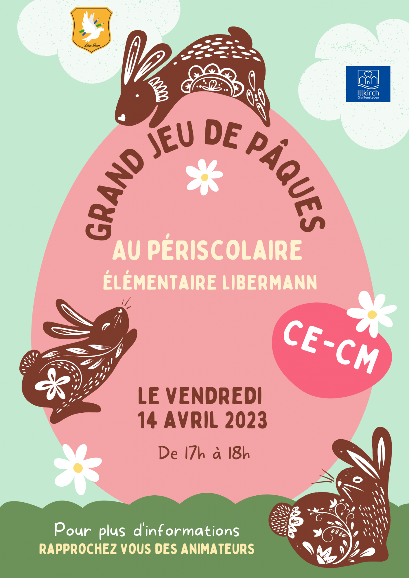 Enfin, avant de partir en vacances, nous proposerons non pas un, mais deux grands jeux sur la thématique de la fameuse chasse aux œufs. Un premier jeu se déroulera à la maternelle Libermann à destination des « petits-moyen-grands » et les CP du périscolaire élémentaire Libermann. Un deuxième se déroulera en même temps sur site élémentaire, cette fois ci élaboré par trois enfants en classe de CM2, à savoir Léa, Marie et Louane à destination des CE et des CM.