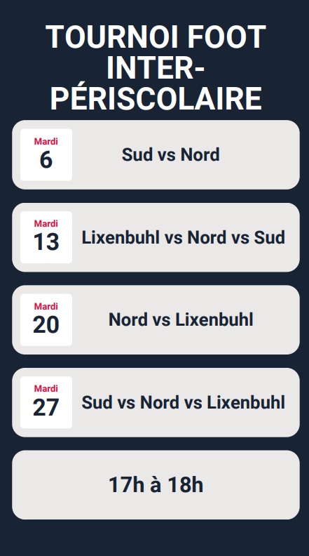 Le tournoi a eu lieu tous les mardis de Juin : 6 (annulé car mouvement de grève), 13 et 20 (à la Lixenbuhl) et le 27 au Muhlegel pour terminer avec remise de la coupe remportée par le périscolaire du sud.