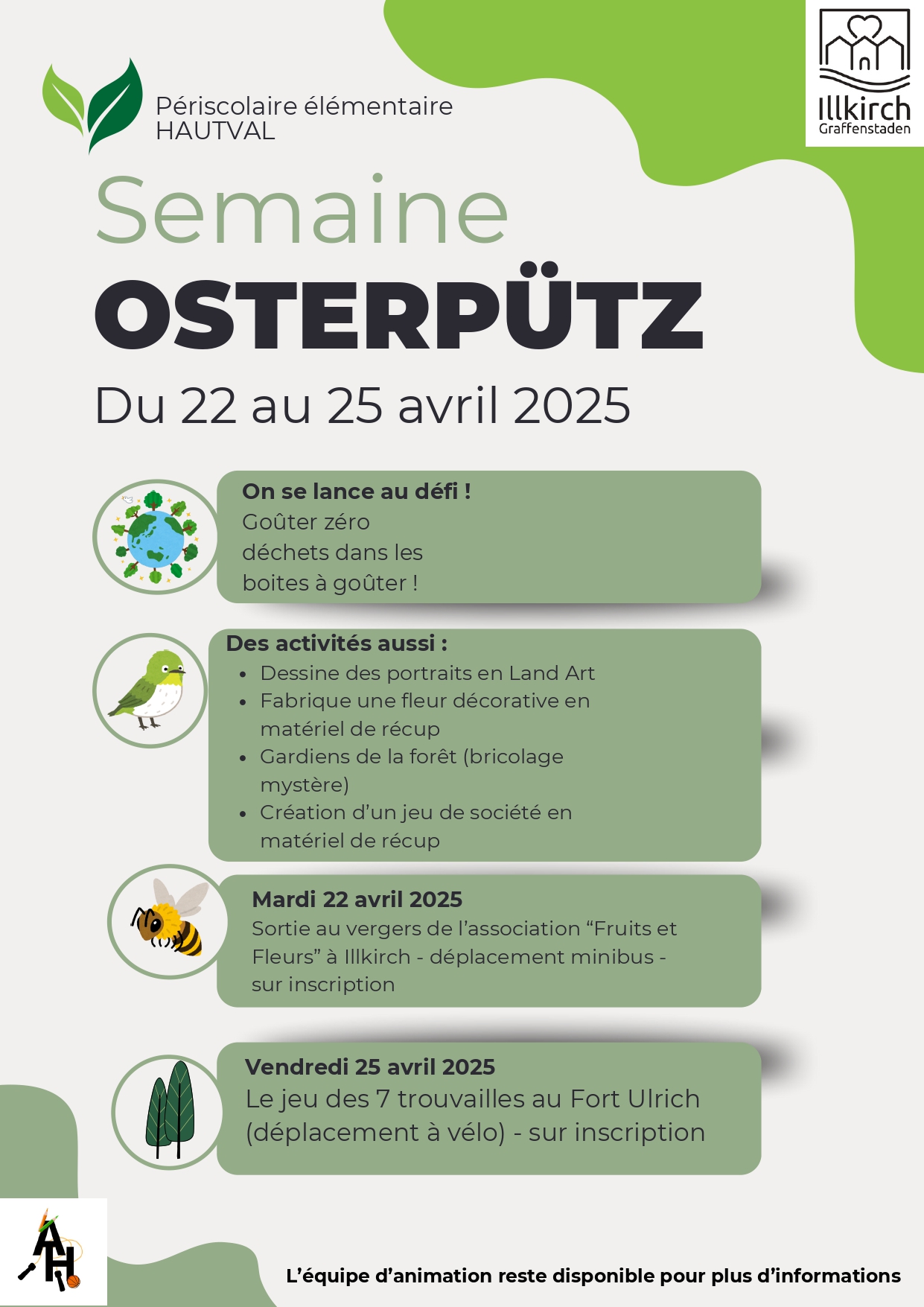 C’est bientôt le retour de notre semaine thématique « Osterputz » et l’équipe d’animation a donc prévu un beau planning d’activités « nature » pour vos enfants. Mais pas que ! Nous valoriserons cette semaine là les activités manuelles à partir de matériel de récupération, car cela est une valeur qui nous tient déjà à cœur.