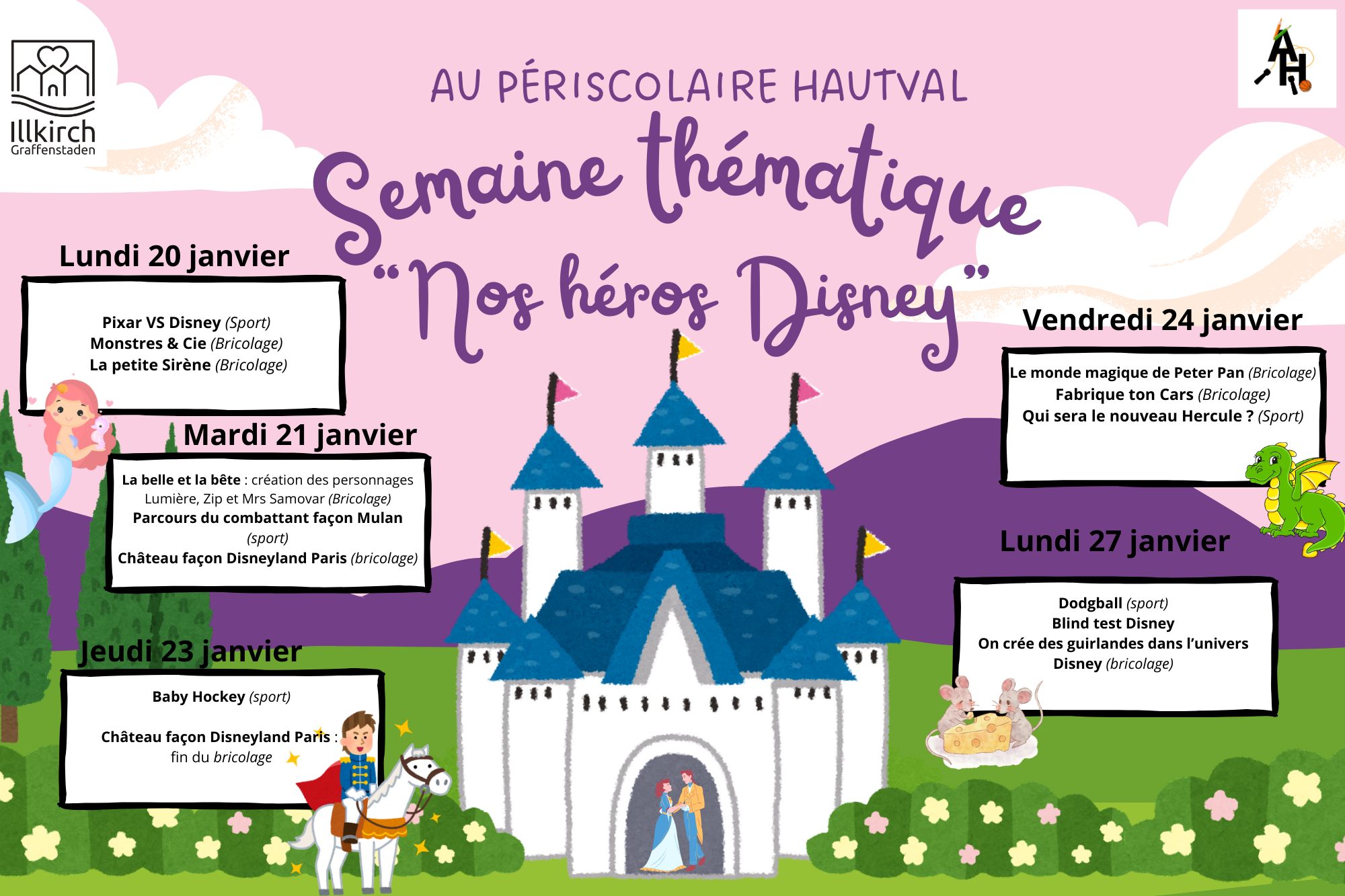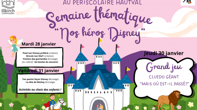 Durant les 2 prochaines semaines, les enfants se verront proposer des semaines thématiques sur le monde de Walt Disney. Pour cela, chaque jour, des activités manuelles, sportives et autres seront mis au planning des enfants et ils pourront choisir ce qui les tente le plus.